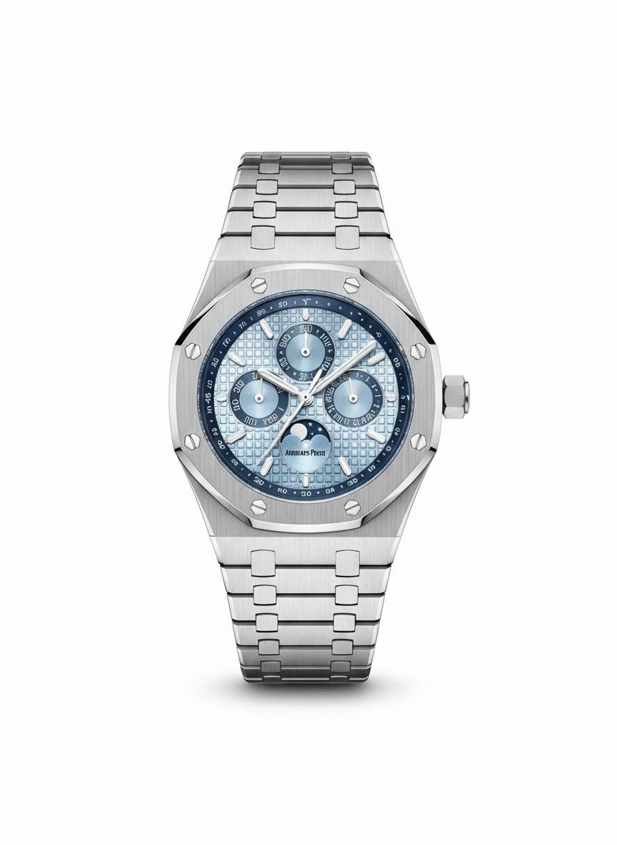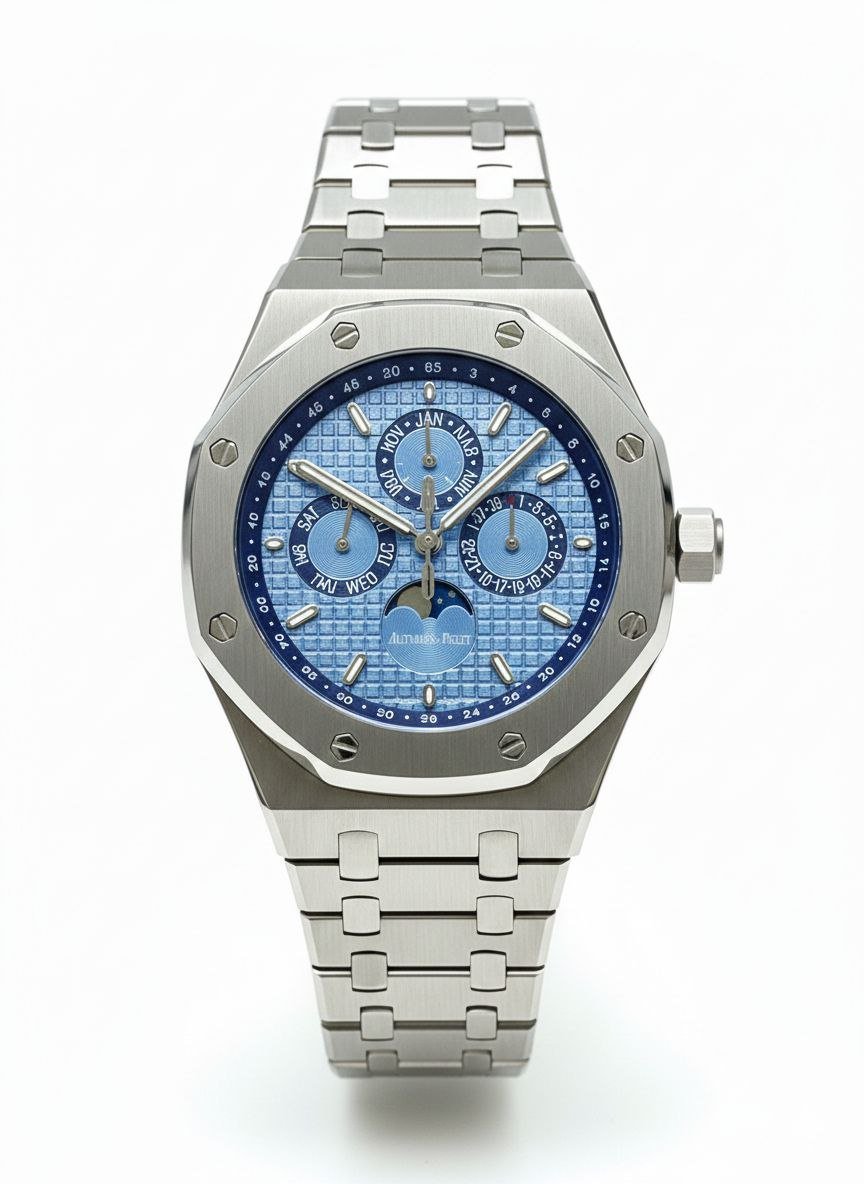 Featuring a Tiffany blue textured dial with luminous hour markers and hands, housed in a stainless steel case with an integrated bracelet. A mirror-style watch inspired by the iconic Royal Oak design, offering a clean and modern sporty-luxury look.