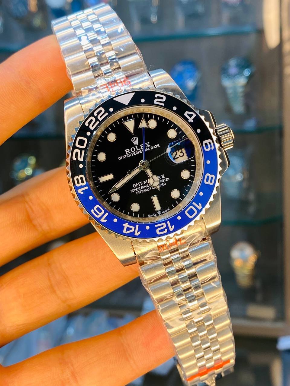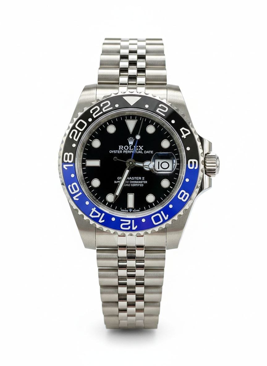 Featuring a blue and black bezel with green luminous hour markers and hands, a date window at 3 o’clock, and a stainless steel Jubilee-style bracelet. A mirror-style watch inspired by the iconic GMT-Master II design, combining sporty functionality with a refined wrist presence.
